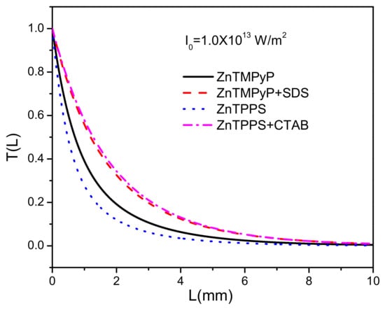 In Figure 4, we plotted the dependences of the energy transmittance on distance L for all compounds with peak intensity W/m. ZnTMPyP and ZnTPPS with SDS and CTAB have the very approximate curves, while ZnTMPyP and ZnTPPS in aqueous solutions could reach rather low values and at L = 2 mm, respectively.
