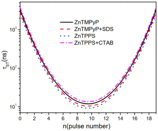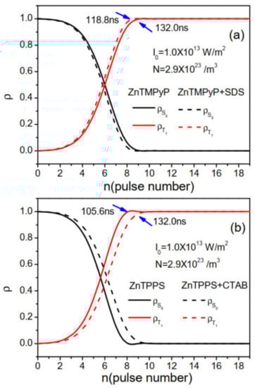 In our calculations, useful photophysical parameters of ZnTMPyP and ZnTPPS in aqueous solutions and their porphyrin J-aggregates with micelles of SDS and CTAB were collected in Table 1 from the experiment [50]. is set as 100 fs for ZnTMPyP and ZnTMPyP+SDS, and ps for ZnTPPS and ZnTPPS+CTAB, respectively [50]. In addition, concentrations for all compounds are set as /m in consistent with the experiment [50]. Unfortunately, it did not give the lifetime of state in experiment [50]. We set for all compounds as s according to another two experiments [26,30].