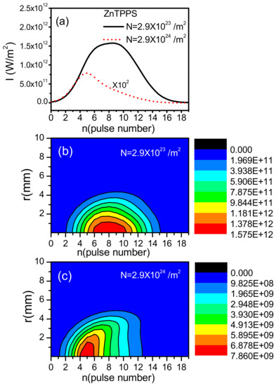 Taking ZnTPPS as an example, we studied the output intensities after OL absorption at L = 1.0 mm for different concentrations /m, /m in Figure 7. At in Figure 7a, we could see that the output intensity decreases 2∼3 orders of magnitude with big concentration /m, and the peak intensity occurs earlier than the cause with small concentration. Comparing the two-dimensional pictures Figure 7b,c, we could notice that the shape of output intensity becomes asymmetric with big concentration. This is because the front part is mainly the two-step absorption , while the latter part is dominated by the one-photon absorption depending on population . The different absorption mechanisms lead to the asymmetric phenomenon. Big concentration means more molecules taking part in the nonlinear absorption and therefore the asymmetry becomes more explicit.