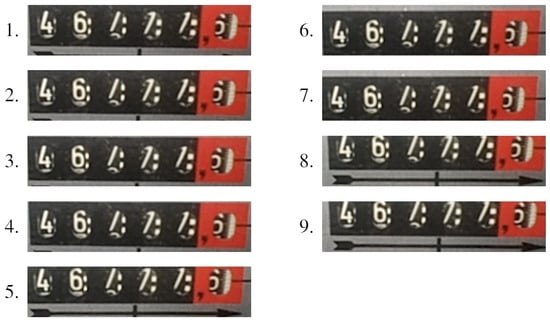 The second assumption is that multiple image frames are captured for each given spatial scene; i.e., multiple recognition attempts are performed, each of which generates a recognition hypothesis as described in Equation (1). For example, Figure 1 shows a set of image frame segments derived from a video stream captured by a mobile phone application. Each frame is processed separately by the external number recognition system introduced in [1,6]. In Table 1, for each frame, a recognition hypothesis is provided.