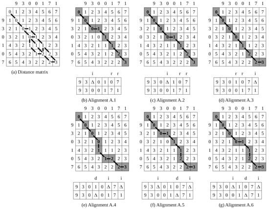 However, to find all optimal alignments between two sequences, it is necessary to backtrace from cell D [ m , n ] to cell D [ 0 , 0 ] . For each cell in D (except cell D [ 0 , 0 ] ), it is necessary to keep track of which matrix cell participated in the calculation of the value of the given cell (in accordance with Equations (5) and (6)). Each path starting at cell D [ 0 , 0 ] and ending at cell D [ m , n ] represents an optimal alignment. To continue the previous example, there are six possible minimum-cost paths in matrix D, i.e., six optimal alignments between sequences 930,107 and 9,300,171, as shown in Figure 2b–g. The minimum-cost paths are marked with a gray background. Horizontal edges in a path determine insertions, vertical edges determine deletions, and diagonal edges determine replacements. The alignments are given under each corresponding matrix. Single-symbol edit operations of insertion, deletion, and replacement are, respectively, denoted by letters i, d, and r. Spaces added to sequences are represented by special symbol △ (i.e., a gap) not belonging to alphabet S.