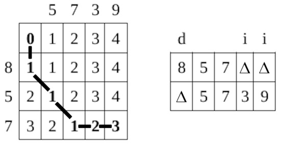 One of the basic algorithms for finding the optimal alignment of two sequences is related to the widely acknowledged edit distance (i.e., the Levenshtein distance) [11,12,13]. The standard minimum edit distance between two sequences is defined as the minimum number of single-symbol edit operations (i.e., deletion of a symbol, insertion of a symbol, and replacement of a symbol by another symbol) required to transform one sequence into the other. In a more general case, the edit operations are weighted, and the calculation of the minimum edit distance can be described as follows. Let s i and s j be two sequences of lengths m and n, respectively, over alphabet S: