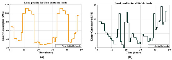 The total energy consumption () and cost () of all non-shiftable and shiftable appliances are given in Equations (3) and (4), respectively.