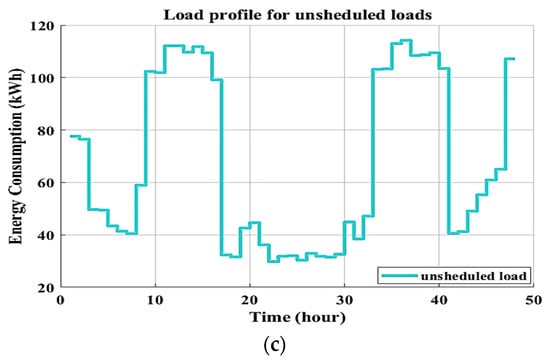 The non-shiftable load profile on an hourly basis based on the load data (Table 1 and Table 2) is shown in Figure 6a. The hourly curve of shiftable loads is presented in Figure 6b. Figure 6c depicts the total load profile, which includes both shiftable and non-shiftable loads. The adopted virtual load data were assumed to be approximately simulated domestic actual load statistics in houses and residential structures. Therefore, they can be installed in homes or residential buildings. When the load data are input into an optimization method, a change is made to the time slot of the unschedulable shiftable load profile. To minimize the energy demand, PAR, and electricity cost, the proposed optimal DSM program only manipulates the non-scheduling shiftable load curve based on the maximum energy consumption and time shift hours according to Table 3. With this change, various appliances may be scheduled to run during off-peak hours rather than during peak hours, resulting in lower energy use. As the time intervals (horizon axis) shift, the magnitude of energy consumption is also altered, as peak consumption is shortened and peak-to-average energy is lowered.