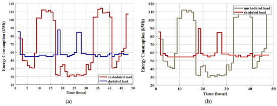 Figure 7 illustrates the simulation results for the adopted residential area energy consumption and for two days (48 h) when the DSM programs based on optimization algorithms are applied and loads are successfully shifted to off-peak hours. It can be seen in the scheduled load curves that on-peak energy consumption (from 9 h to 16 h in the first day) decreases, and off-peak consumption (off-peak hours equal daily hours except on-peak hours) increases. Consequently, the peak-to-average ratio decreases. Therefore, management reduces energy consumption and the electricity cost. The peak demand value of the proposed algorithm-based DSM is up to 87 kW, which is the lower than without the use of the DSM program and optimization algorithms (114.2 kW). Residential customers should attempt to schedule their peak loads for times when electricity prices are relatively low, which results in a lower electric bill. As illustrated in Figure 7, residential users can significantly reduce their daily bill for electricity through proper scheduling of loads. The adopted algorithms achieve very similar energy consumption and cost-saving results (all up to 16.3% savings). The peak demand is decreased below the maximum predetermined energy consumption limit in the scheduled curve, from 114.2kW to 87kW. In general, the DSM technique performs better as the number of controllable or shiftable appliances grows. The results prove that the proposed optimal DSM program effectively manages a number of residential loads in a residential area by shifting controllable loads in order to reduce peak energy consumption.