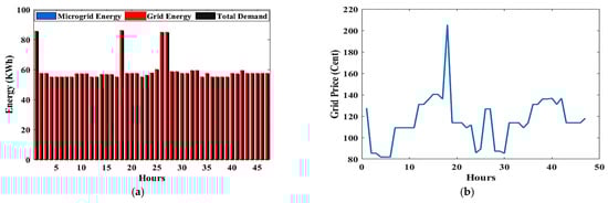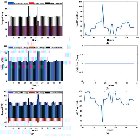 Figure 8 illustrates the amount of power generated by the MG and the grid, the amount of power consumed by loads, and the costs associated with the grid. Figure 8a,c,e,g assume that the MG supply power is set to 0%, 50%, 100%, and 125% of the total power consumed by the loads, respectively. Their costs are represented graphically in Figure 8b,d,f,h, respectively. As shown in Figure 8a, there is no MG power, and all loads are supplied by the utility grid, implying that the cost will be high, as illustrated in Figure 8b. In Figure 8c, the MG power is half of the consumption power, so there is a power supply deficit. Therefore, the utility grid supplies this deficit, and its cost shown in Figure 8d. There is no power supply shortage in Figure 8e because the MG power is equal to the consumption power. Consequently, the total energy demand is met by MG resources. As depicted in Figure 8f, there are no costs in this case because all loads are supplied by MG resources only. In the final case shown in Figure 8g,h, no power is purchased, but power is sold from the adopted MG to the utility grid, as the MG power is been expanded by 25% of the total consumption power.