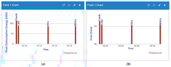 (a) Peak energy consumption and (b) electricity costs for both the unscheduled and scheduled load profiles displayed via ThingSpeak platform.