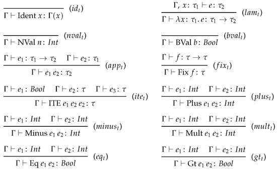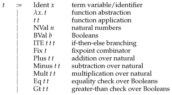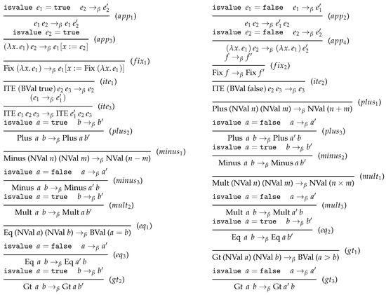 Notice that the symbols ‘+’, ‘−’ and ‘×’ appearing in the conclusions of the rules , , and are, respectively, denoting addition, subtraction, and multiplication over natural numbers. Similarly, the symbols ‘=’ and ‘>’ used in the conclusions of the rules and are employed to denote Boolean equality and greater-than checks. The rules to define branching , , and are indeed folklore. The term ITE evaluates in a single step into if is the Boolean value true; into if is the Boolean false. Otherwise, it reduces to ITE if evaluates into . There is a fixpoint combinator Fix that takes a term f and, in a single beta-step, replaces every occurrence of the variable (or identifier) x with the term f itself in e if f is a Lambda term, such as . Otherwise, if f is evaluated into in a single beta-step then the term Fix f reduces into Fix . The rules governing operations over ’naturals’ and Booleans are also very usual. The term Plus x y reduces into the natural number (denoted NVal ()) if x is a natural number a (NVal a) and y is a natural number b (NVal b). If this is not the case, plus x y evaluates into Plus x if x is a value; into Plus y, otherwise, given that x reduces to and y reduces to in a single step. The other rules concerning subtraction, multiplication, equality, and greater-than checks should be read in the same manner as addition. Note also that the terms that are marked values (by the isvalue function) do not evaluate any further, similar to variables (or identifiers).