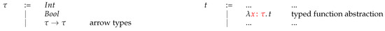 One crucial point to underline is that the type system here allows only for ordinary function/arrow types leaving aside dependent and polymorphic function types. Namely, it is a variant and an extension of the simply typed Lambda calculus; not as expressive as, other calculi in Barendregt’s cube [22], such as System F [23], System nor [24]. The type system involves two base types Int and Bool with the possibility of inductively constructing “Arrow” types out of them. Notice also that in implementing binders, we embark on the choice of “concrete syntax” due to Church [2], in which the identifiers of Lambda terms are just strings. This choice definitely requires some extra care when it comes to avoid variable capture. See Section 2.4, especially the text following the subst function, for a further explanation. Another point to draw attention to is that the term constructor NVal adds to the set of terms the natural numbers (nat) of Coq. Similarly, the constructor BVal enriches the set of terms with the Coq Booleans (bool).