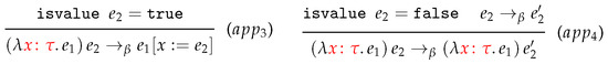 - . We proceed with a case distinction on the term . Note that the statements where is a value trivially hold, no further reductions from are possible, which contradicts the assumption of the case. We have the statement to be proven for the remaining cases, due to the rule () stated in Figure 2. To prove this statement, we specialize the induction hypothesis () with proper terms and types, and turn it into . This fact and the rule () presented in Figure 4 give us .