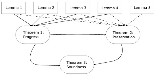 We devote this section to step-by-step explore the soundness proof of the type system presented in Figure 4. It may be beneficial to first look into the chart in Figure 6 that exhibits the dependency among statements proven further in this section, and then read the proof terms in detail.