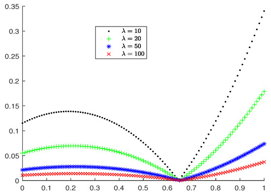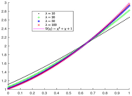 We remark that our results are rather general. For instance, one can get the error estimates from our results for different existing Bernstein–Durrmeyer–type operators, such as operators given in [14,15], by selecting different parameters and . Moreover, we can obtain the new operators, which provide better approximations for different target functions. In general, different target functions need different parameters. The choices of the parameters show the flexibility of the operators . In fact, for a given target function ℑ, we can choose appropriate parameters to obtain a smaller error of the approximation by . This feature will be of great interest to practical applications. We illustrate this feature by some numerical experiments.