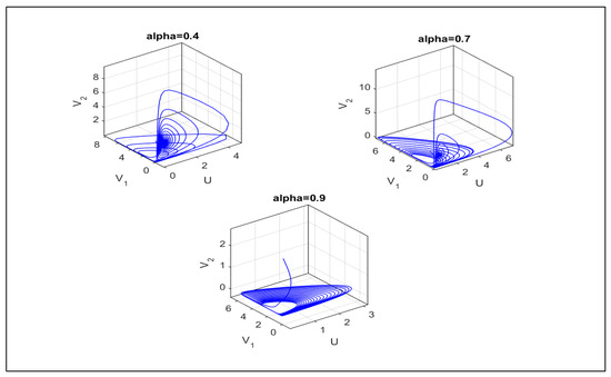 Figure 1 presents the phase portraits of the fractional-order model (1–3) for different values of fractional parameter “”. The initial conditions taken are , whereas the values of other parameters are . We have taken three values of fractional order as α = 0.4, 0.7, and 0.9.