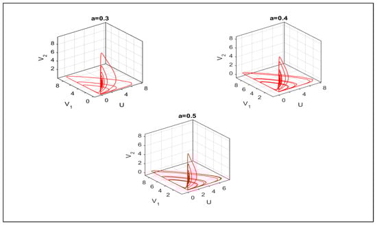 Figure 2 demonstrates the phase portraits of the fractional-order system for three different values of “a” as 0.3, 0.4, and 0.5. The values of other parameters and ICs are , .