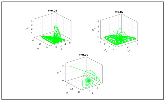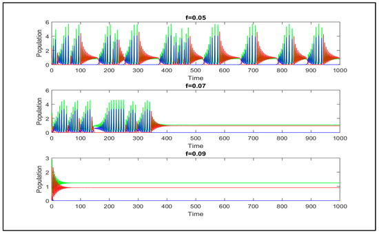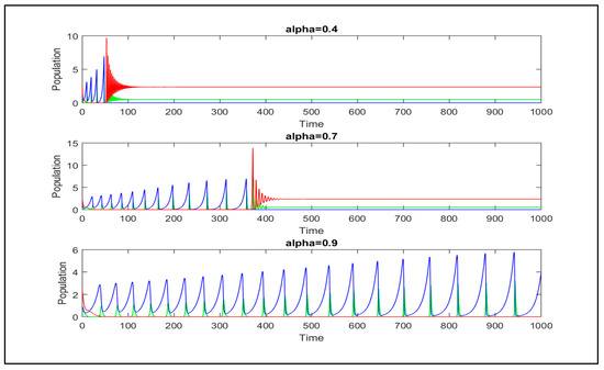 Figure 3 presents the phase portraits of the fractional-order model for different values of common food parameter “” as 0.05, 0.07, and 0.09. The initial conditions and values of parameters are . It is obvious that the system moves towards stability for higher resource parameter values.