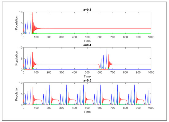 Figure 4 presents the time series solution of the model at different values of “a” 0.3, 0.4, and 0.5. The values of other parameters are the same as those in Figure 1.