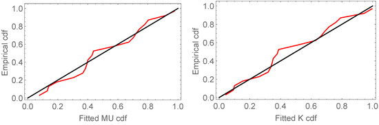 In this part, we analyze two real data sets to demonstrate the performance of the MU model in practice by fitting two real-life data sets. The proposed MU model is compared to models based on the following distributions: the K distribution, which is defined by the pdf in Equation (6) and other four known competitors such as
