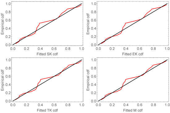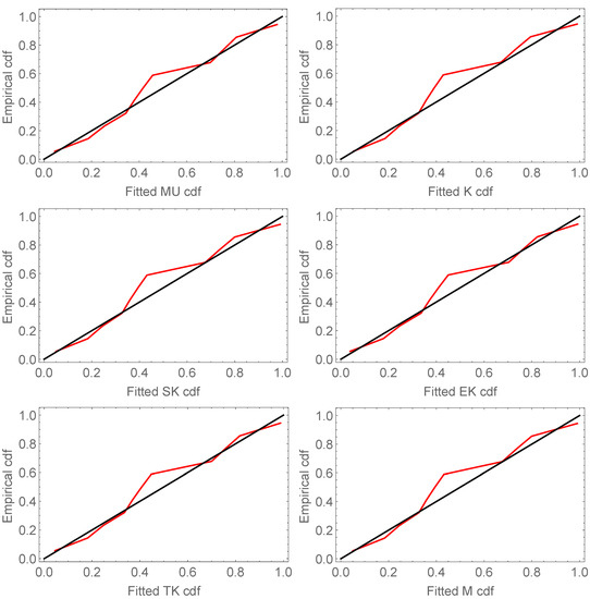 The probability–probability (P-P) plots of the fitted models for the two data sets are shown in Figure 4 and Figure 5. It can be observed that the MU model achieves a better approximation between the empirical and theoretical curves and provides a better fit than other models.