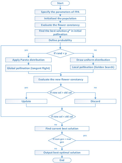 where denotes solution vector at the iteration. denotes solution vector at the iteration. is used to represent Pareto distribution. The is the best global solution. Additionally, the is the step size. The switching probability controls the local and global search processes in the FPA. The switching probability allows pollens to investigate and be used during global and local pollination operations. Pollens are permitted to explore the key space to identify the best method for global pollination while maintaining the diversity of the approaches. The exploration and operation phase of the FPA allows it to perform better than other algorithms and handle complex situations.