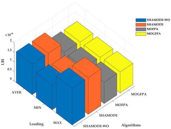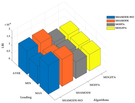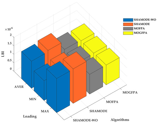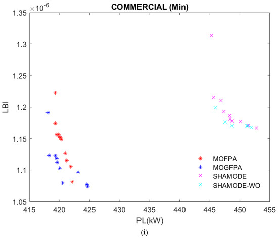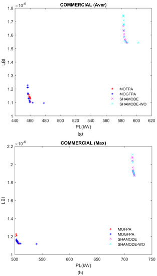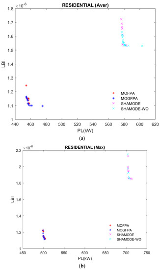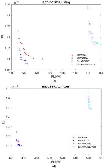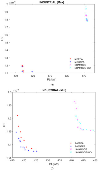 The IEEE 33 bus system has been considered for visualizing the performance of the proposed MOGFPA. Through the MOGFPA, the average PLs and LBI are determined to be 282.86 kW, 0.0015, 281.76 kW, 0.0014, 284.24 kW, and 1.49 × 10−3 for industrial, residential, and commercial loads, respectively. That is much lower than other algorithms such as SHAMODE [29], MOFPA [30], and SHAMODE–WO [31]. The bus system PLs are reduced with the help of the above methodology. The proposed algorithm is used to optimally select the optimal location for feeder connections and DG while considering the problem of MO having PLs and the LBI as crucial parameters. The optimal switching connections while implementing the algorithms are summarized in Table 2. This means that by determining the best point for DG placement by minimal PLs and determining the optimal configuration for switches, the parameter LBI also needs to be addressed carefully. Moreover, the minimum and maximum limits are also compared, as shown in Table 3, to show the robustness of the proposed algorithm.