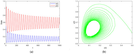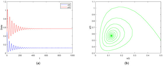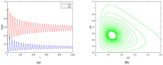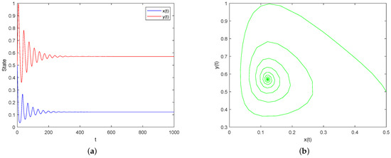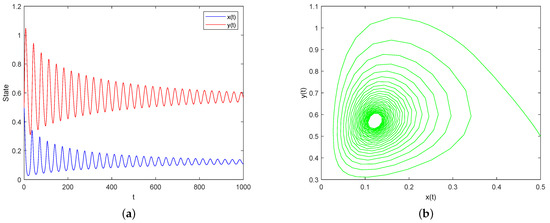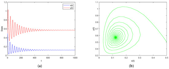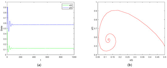 Case I: Assume and and keep other parameters the same as (32). By simple calculation, . Then, the condition of Theorem 5 is satisfied, which implies that is locally asymptotically stable, as shown in Figure 1.