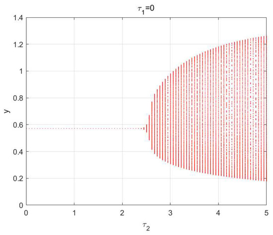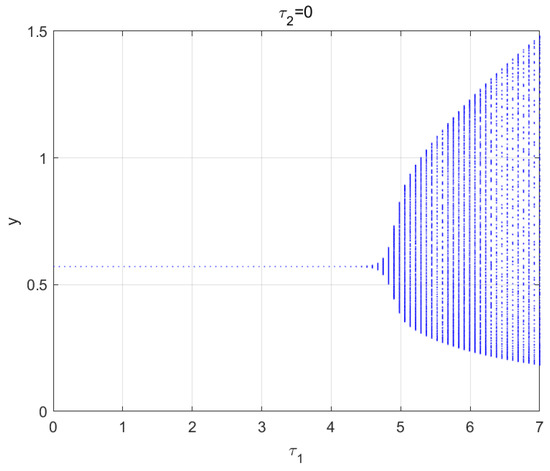 When , Equation (21) has no positive roots and no real exists. So, is locally asymptotically stable for any ;