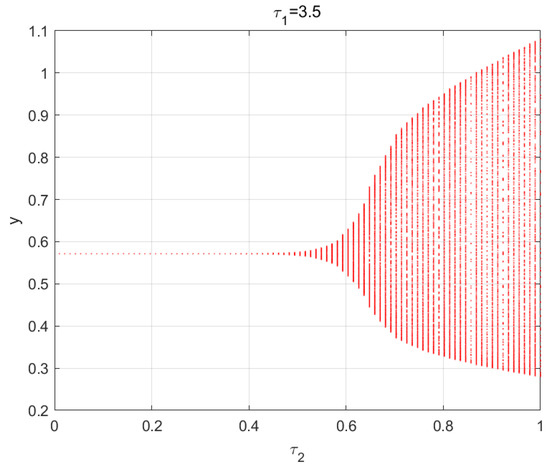 Case III: Assume and gradually increase the value of , keeping other parameters remaining in (32) unchanged. After numerical calculation , according to Theorem 7, we can obtain the critical value of . When , the system (1) is locally asymptotically stable as shown in Figure 5 and unstable for , which is illustrated by Figure 6. Furthermore, the system (1) experiences a Hopf bifurcation at (as shown in Figure 7).