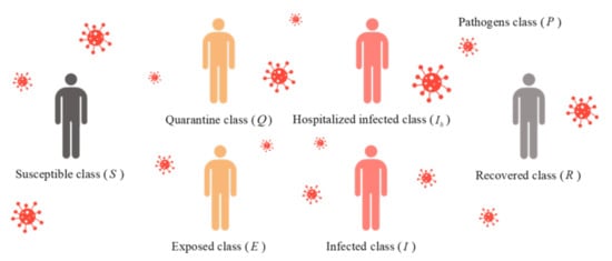 Here, this research considers the total human population as and the number of pathogens present in the environment as P. The initial conditions are as follows: , , , , , and . An overview of the population for the spread of COVID-19 is shown in Figure 2.