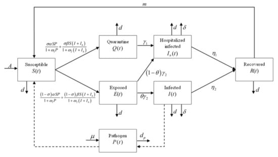 Several models have been used to study the COVID-19 epidemic such as SIR, SIRS, SEIR, and others. This research studies the spread of COVID-19 by dividing the human population into six main groups: susceptible class (S), quarantine class (Q), exposed class (E), hospitalized infected class (), infected class (I), and recovered class (R), in conjunction with pathogens (P) in the environment spread by an infected class as shown in Figure 1. The model name is SQEIRP, and the model was presented in Equation (1) and Equations (3)–(8). The idea for this model comes from Samuel Mwalili and Ebrahem A. Algehyne, who studied the spread of COVID-19 using the SEIRP model in 2020 and SQIR model in 2021, respectively.