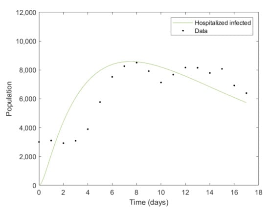 The simulation of the hospitalized infected population compared to the actual data from 1 January 2022 to 17 January 2022.