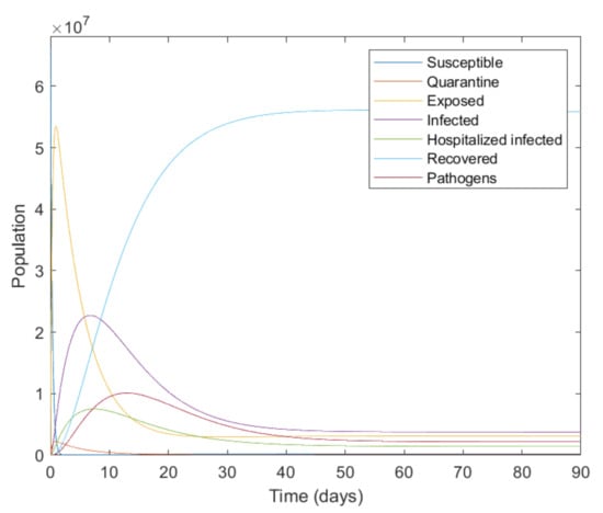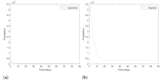 The dynamic of the susceptible population declines rapidly over a period of 0–3 days, with the initial population set at 66,170,000. This decline in population shifts to populations that are in the incubation period after exposure to the virus. The incubation period population dynamics are divided into two types: quarantine class, and exposed class, as shown in Figure 5a,b respectively. The dynamics of the quarantine and exposed class increase rapidly over the period of 0–1 day. The maximum population of the quarantine class is approximately 2,200,000, which is less than the maximum population of the exposed class of approximately 53,000,000. After day 1, the dynamics of both populations decline rapidly.