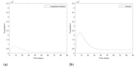The dynamics of the hospitalized infected and infected population are related to the dynamics of the quarantine and exposed population, respectively. As a result of the incubation period population changes to the infected population, the dynamics of hospitalized infected population and infected population increase rapidly over 0–7 days, with the peak population estimated at 7,500,000 and 22,700,000, respectively. After that, it declines rapidly. The dynamics of the hospitalized infected and infected population are shown in Figure 6a,b respectively.