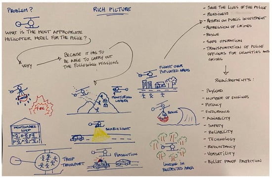 The rich picture methodology, representing a system and its interactions through graphic diagrams, was used to understand and describe the problem, allowing for a more precise and accurate visualization of the theme addressed. Figure 1 depicts the real world experienced by the actors using rotorcrafts in police activities. The rich picture is one of the stages of Soft System Methodology (SSM) developed by Professor Peter Checkland [], and one of the characteristics is the freehand production of the problem situation studied. In Figure 1, we depict the various daily activities faced by police organizations in the city of Rio de Janeiro, Brazil, such as air support for police teams fighting drug traffickers in the slums of Rio de Janeiro, the air patrol of overpopulated areas, the rescue of people in distress, the pursuit of fugitives, and the transport of troops for incursions into conflict areas. In summary, Figure 1 illustrates the need for mobile wing aircraft to support police activities.