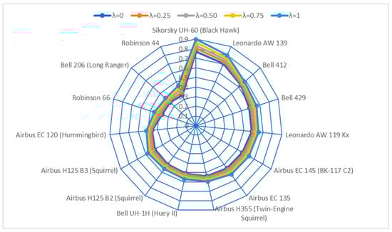 According to Zavadskas et al. [], to increase the classification accuracy and effectiveness of the decision-making process, a generalized equation, Equation (5), aggregates the two methods used in the analysis. To calculate the relative importance of the methods, the variable λ, whose values range from zero to one (0 ≤ λ ≤ 1), is used. In the present study, to increase the accuracy of the results, three values were used for the variable λ: 0.25, 0.5, and 0.75. Table 7 summarizes the results generated for the set of λ = {0, 0.25, 0.50, 0.75, 1}. Considering that the best alternatives are those with the highest Qi value, alternatives were ranked by decreasing score. Figure 2 illustrates the ranking of the helicopters, where the first option is Alternative A15 (Sikorsky UH-60 (Black Hawk)).
