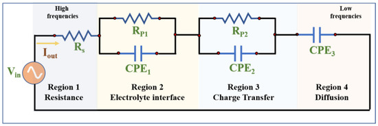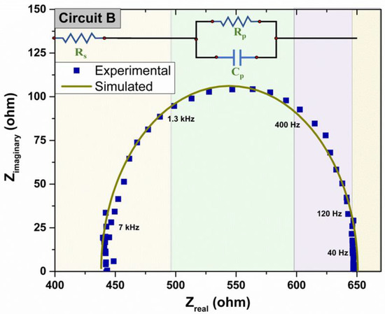 The Randles circuit is one of the most useful models to simulate physical and chemical processes in energy devices such as batteries [23]. For instance, Rong et al., studied a hole-conductor-free TiO2/CH3NH3PbI3 heterojunction solar cell by EIS to further understand the charge-transport process in the perovskite device [24]. They used two Randles circuits, conformed by resistance and capacitance in parallel. At high frequency, a semicircle was observed, attributed to the perovskite-counter electrode interaction. At the same time, the second Randles model represents the charge transfer resistance and recombination at TiO2/perovskite interface occurring at low frequency. The EIS measurements were consistent with the previously recorded J–V curve and the differences in open-circuit potential. Another application of the Randles circuit can be found in the area of corrosion [25,26]. A nanocompound of ZnO–Cr2O3/epoxy was studied as a protective layer for mild steel in a 3.5% NaCl solution [27]. The EIS technique was used to elucidate the anti-corrosion mechanism of the nano compound. The author observed a single depressed semicircle with the center under the real axis from the Nyquist plot. The fitness of the spectra was achieved by using a Randles circuit consisting of a resistance and capacitance representing the charge transfer resistance and the double-layer capacitance. Also, series resistance was considered to model the solution resistance.