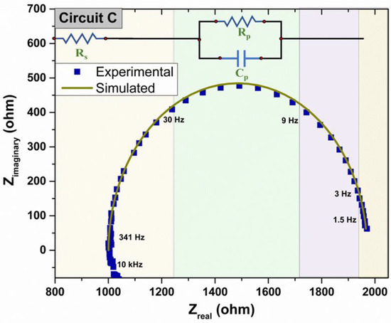 The last case study is presented in Figure 5. The high-frequency region of the semicircle deviates from the reported shape of the Randles circuit. As mentioned before, this could be due to high-frequency noise, but this does not affect the general behavior of the circuit. Due to the high capacitance, the semicircle starts at the intersection of the real axis at a lower frequency, c.a. 500 Hz. From Table 1, it can be seen that the estimated parameters are very close to the used electrical elements. Thus, the simulated curve fits the target data very well. HGA has an advantage over analytical methods and deterministic techniques such as the Lambert W-function because it can handle wrong guesses or limits and avoid local optimum [30,48]. From Figure 5, it is clearly observed that the capacitor has no contribution at high and low frequencies, and only Rs and Rp represent an impedance to the system. From an electrochemical point of view, we can say that the internal or electrolyte resistance, Rs, is high with a value c.a of 1000 Ω. Compared with Circuit B, the wide semicircle indicates the high resistance the material offers to the current flow.
