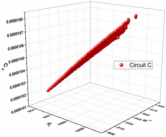 It should be mentioned that in multi-objective problems, a single objective is optimized simultaneously, and the optimization process is a set of more than one best individual that is represented as the Pareto optimal solution [51,52]. Figure 6 shows the Pareto front for the best individual obtained by the heuristic GA. The red spheres form a three-dimensional curve surface. It can be seen that the multi-objective approach for EIS parameter optimization presents good results because the individuals are concentrated in one region that follows a consistent trajectory. From the curve surface, a direct relationship between the estimated parameters can be seen. For example, an increase in capacitance also increases the value of Rs and Rp. Therefore, this helps to make all parameters optimal at the same time. Thus, it demonstrates that heuristic crossover enhances optimization by producing the best individual fitness for the multi-objective problem.