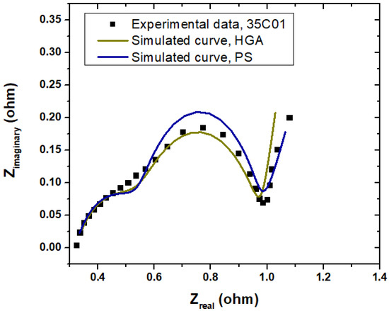 Figure 8 presents the experimental Nyquist plot and the simulated curve computed using the parameters obtained from the HGA. It is evident that the estimated parameters fit well with the experimental curve, indicating that the implemented HGA procedure is versatile and can estimate parameters with appropriate accuracy. The effectiveness of the proposed HGA in estimating the parameters of Li-ion battery is demonstrated by comparing this algorithm with the patterns search (PS) algorithm available in the Matlab optimization toolbox. The former algorithm is based on iteratively searching space computing for a set of points close to the Pareto front without any analytical information about the function under study and converging to the optimal global solution without needing any derivative calculations [56]. The estimated error (Root Mean Square, RMS) for the HGA was 0.0116, while the PS algorithms presented an RMS error of 0.021. It should be mentioned that those values are close to those reported in the literature. For example, Li et al., obtained an RMS error of 0.0145 using an improved particle swarm optimization algorithm to determine Li-ion battery parameters [57]. Thus, this confirmed the effectiveness of HGA in estimating the Li-ion battery parameters. It should be mentioned that practitioners require knowledge about the electrochemical process under study to correctly propose the equivalent model elements, especially when a constant phase element and Warburg diffusion elements are required.