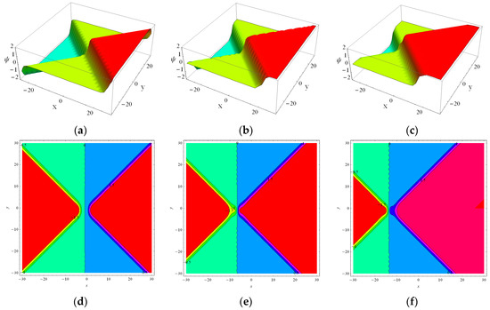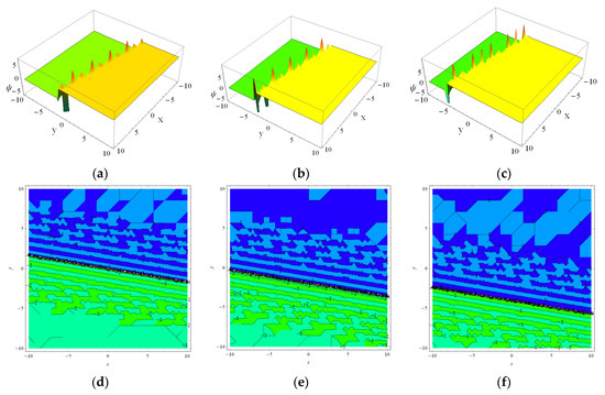 The 3-D plots and 2-D contours of Equation (6) with the parameters as , , , , , and at . (a,d) for , (b,e) for , (c,f), and for .