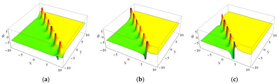 By assigning the parameters as , , , , , , , , , , and , we present the performance of Equation (13) in Figure 2 for at , , and through the 3-D plots and 2-D contours. We can find that the multi-wave is formed by the interleaving and superposition of two waveforms. As time goes on, one wave is propagating along the negative direction of x-axis and positive direction of y-axis, on the other hand, the other wave is propagating along the negative direction of the x-axis and y-axis.