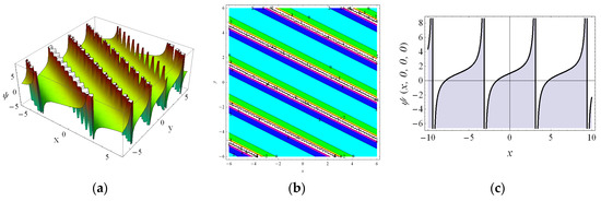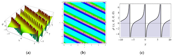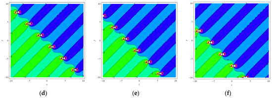 Figure 3 presents the behaviors of Equation (16) by selecting the parameters as , , , and at for , , and via the 3-D plots and 2-D contours. It is easy to see the collision phenomena between the lump and singular periodic waves arising in the outline. With the increase in , the waveform propagates along the negative direction of the x-axis and y-axis.