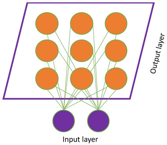 SOM is frequently used to perform unsupervised classification (Figure 1). It operates using three vectors: the first is the input x, the second is the weight m, and the third is the output with s elements, where each element represents the negative of the distance between the x and m matrix vectors constructed from the r rows of the input weight matrix. The competitive function returns a 1 to the winning neuron; however, all other neurons assign a 0.