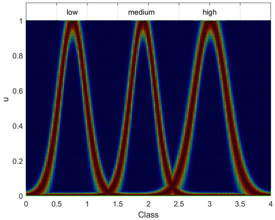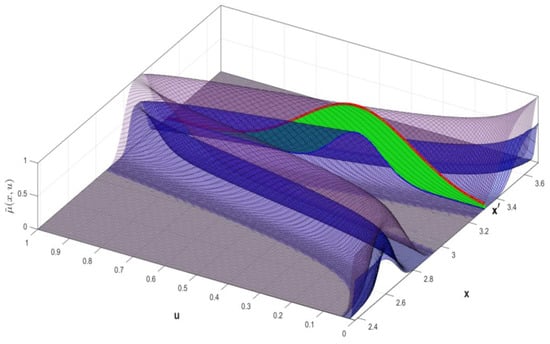 In this case, the lower T2 MF is a subset of the upper T2 MF this is, , then . Then, an IT3 FS is expressed by two T2 FSs, one lower with T2 MF and another upper , with T2 MF postulated by Expressions (16) and (17) (see Figure 2).