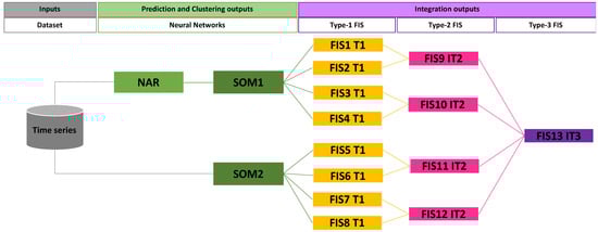 In this work, we propose a computational model that consists of two phases: For the first phase, we carried out clustering and prediction [31,32,33] of the selected time series using neural networks (NNs) [34,35,36]. We then integrated the results by using a hierarchical approach of type-1, interval type-2, and general type-2 fuzzy models (Figure 3).