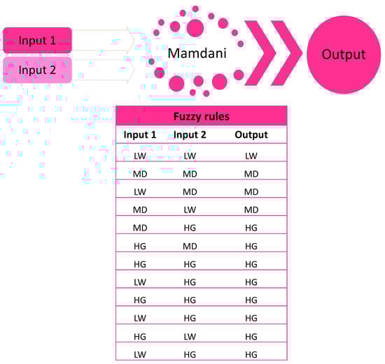 Interval type-2 systems utilized to aggregate the results of type-1 consist of two inputs and one output. In all cases, the MFs are triangular, and the linguistic variables of each function are Low (LW), Medium (MD), High (HG). These are of Mamdani type, with twelve fuzzy rules and centroid defuzzification (Table 4), where the MF parameters were manually tested until obtaining these parameter values (Figure 6).