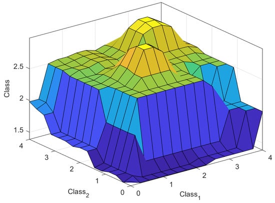 Finally, Figure 11 and Figure 12 exhibit two different perspectives of the type-3 fuzzy model by illustrating nonlinear surfaces, highlighting the nonlinearity of the decision process.