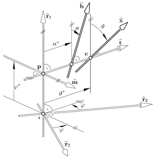 Then, all , and belong to a line congruence whose focus line is the line . This can be realized as follows: we set with respect to the set by its intercept distance , control on the and the angle , control with respect to . We set the dual angle , which realizes the attitude of over . These dual angles are all estimated relative to the (see Figure 2). The following governs the signals: and are via the right-hand screw rule with the thumb pointing on ; the sense of is such that , and , are explained with the thumb in the direction of the . Since is a dual unit vector, we can write out the components of in the following form:
