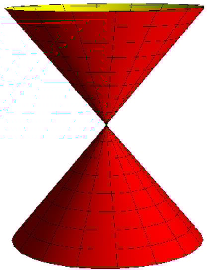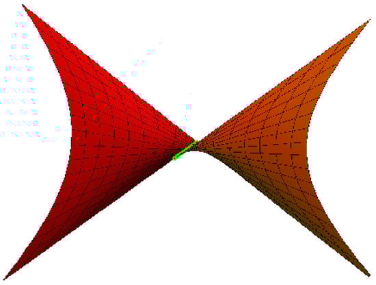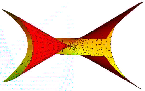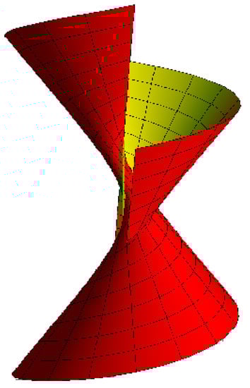 Therefore, presented here is the map provided by E. Study: the ring-shaped hyperboloid may be bijectively mapped to the set of lines. Similarly, the common asymptotic cone can be bijectively mapped to the set of null-lines. Lastly, the oval-shaped hyperboloid can be bijectively mapped to the set of lines (see Figure 1). Then, a regular curve on matches a ruled surface in . Also, a regular curve on matches a or ruled surface in [13,14,15,16,17,18,19].