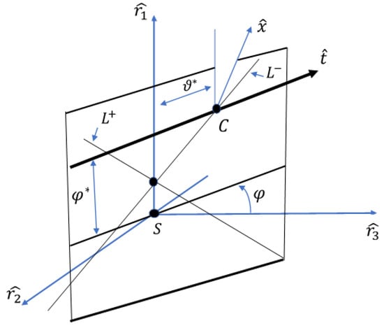 However, the ownerships of this inflection congruence are clarified as follows: via Figure 8, the two lines and are intersected on the at distance . For the orientation , these lines passing through the origin ( and attain the minimal slope is For , the lines are parallel and located on opposite sides of the at a specific distance . Furthermore, if the Equation (88) is resolved with respect to , we obtain