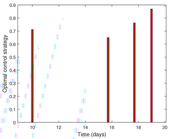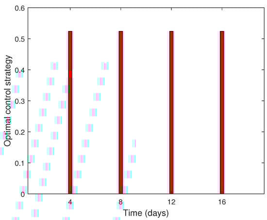 The number of and cells at the terminal moment and the optimal value of objective function is Figure 3 shows the optimal dose at an unfixed time. Figure 4 shows how the number of drug-sensitive and drug-resistant cells evolves over a given time period under optimal pulse control, initial pulse control, and pulse-free control. O (42.8566, 133.6778), M (571.4893, 653.6824), and N (9265.3104, 0) indicate the number of terminal-moment-sensitive and -resistant cells under the three control strategies. Obviously, this control strategy not only reduced the tumor burden, but also further controlled the change in drug-resistant cells.